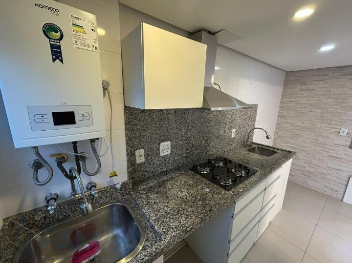 O apartamento é mobiliado e possui armários na cozinha e banheiros, além de uma área de