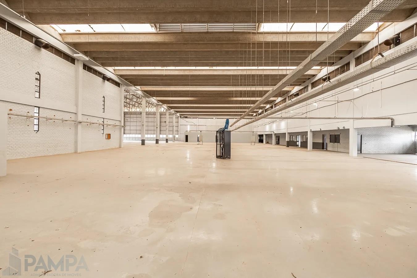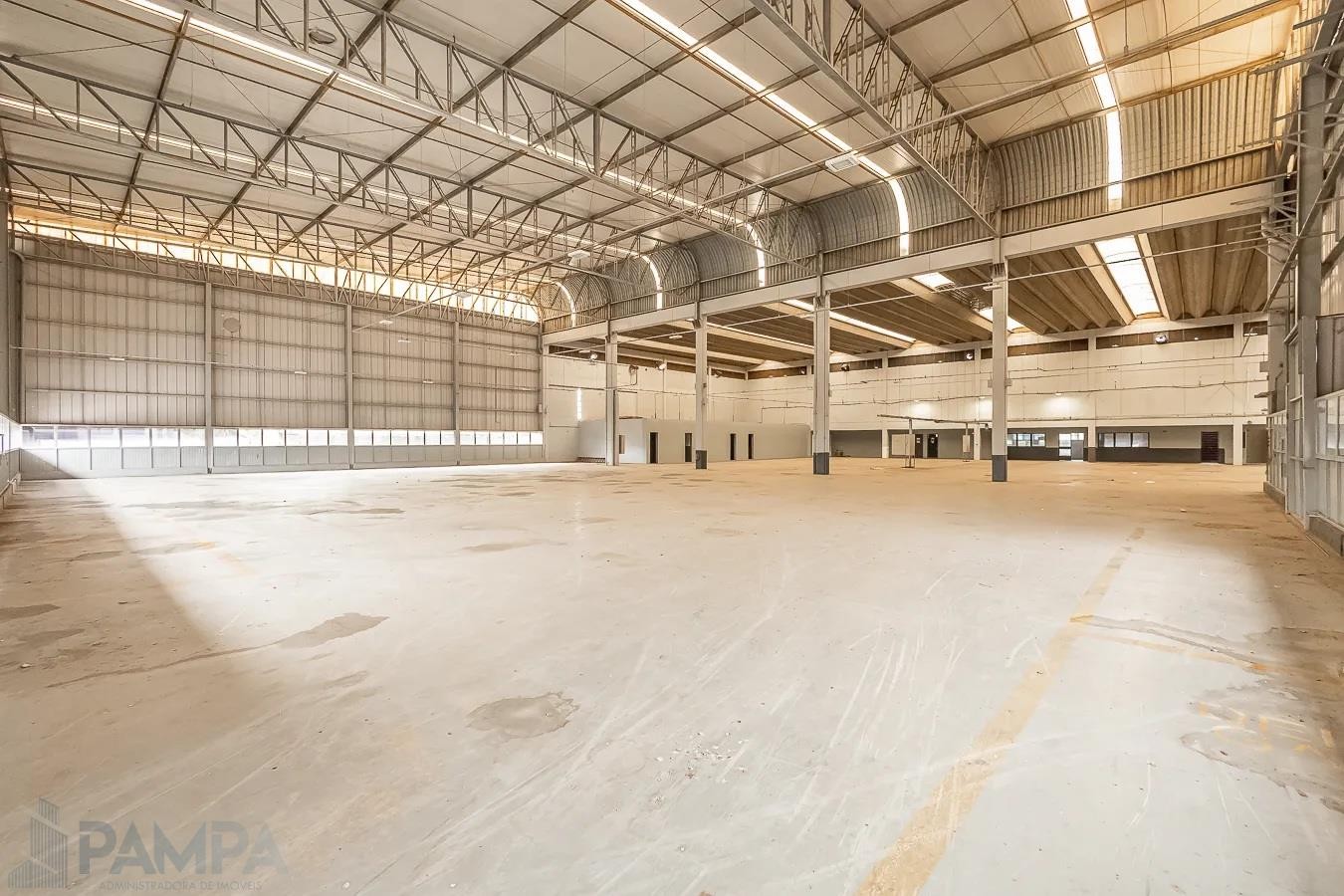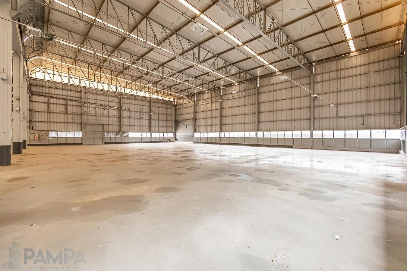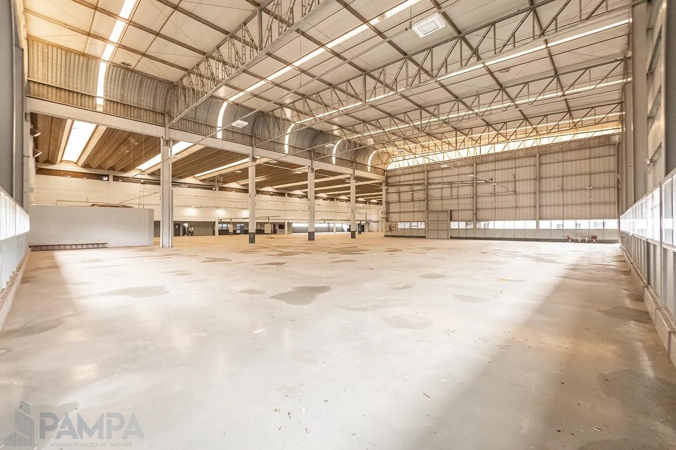 Recepção, amplo pavilhão com vão livre, pé direito de 10 metros, piso industrial, dois conjuntos de banheiros (masculino e feminino) e três portões para entrada de caminhões.