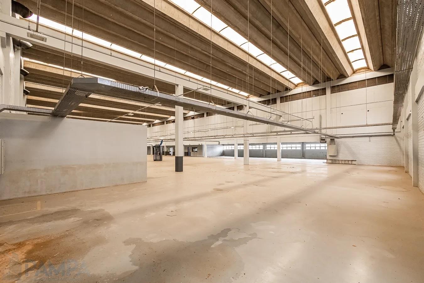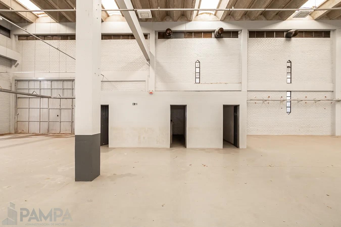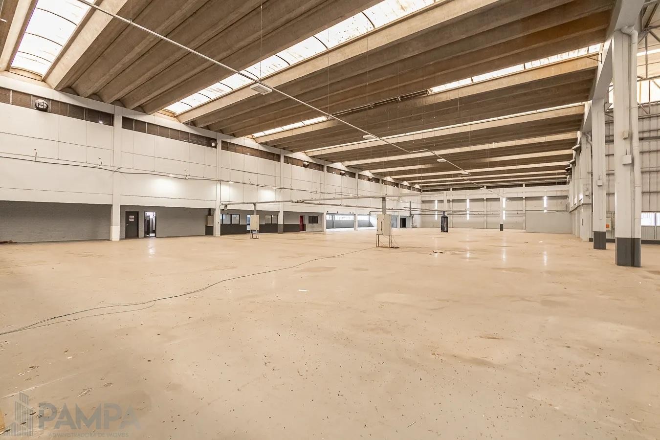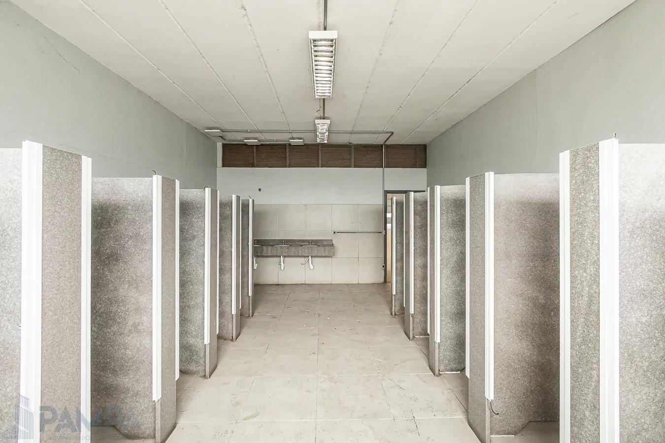Recepção, amplo pavilhão com vão livre, pé direito de 10 metros, piso industrial, dois conjuntos de banheiros (masculino e feminino) e três portões para entrada de caminhões.